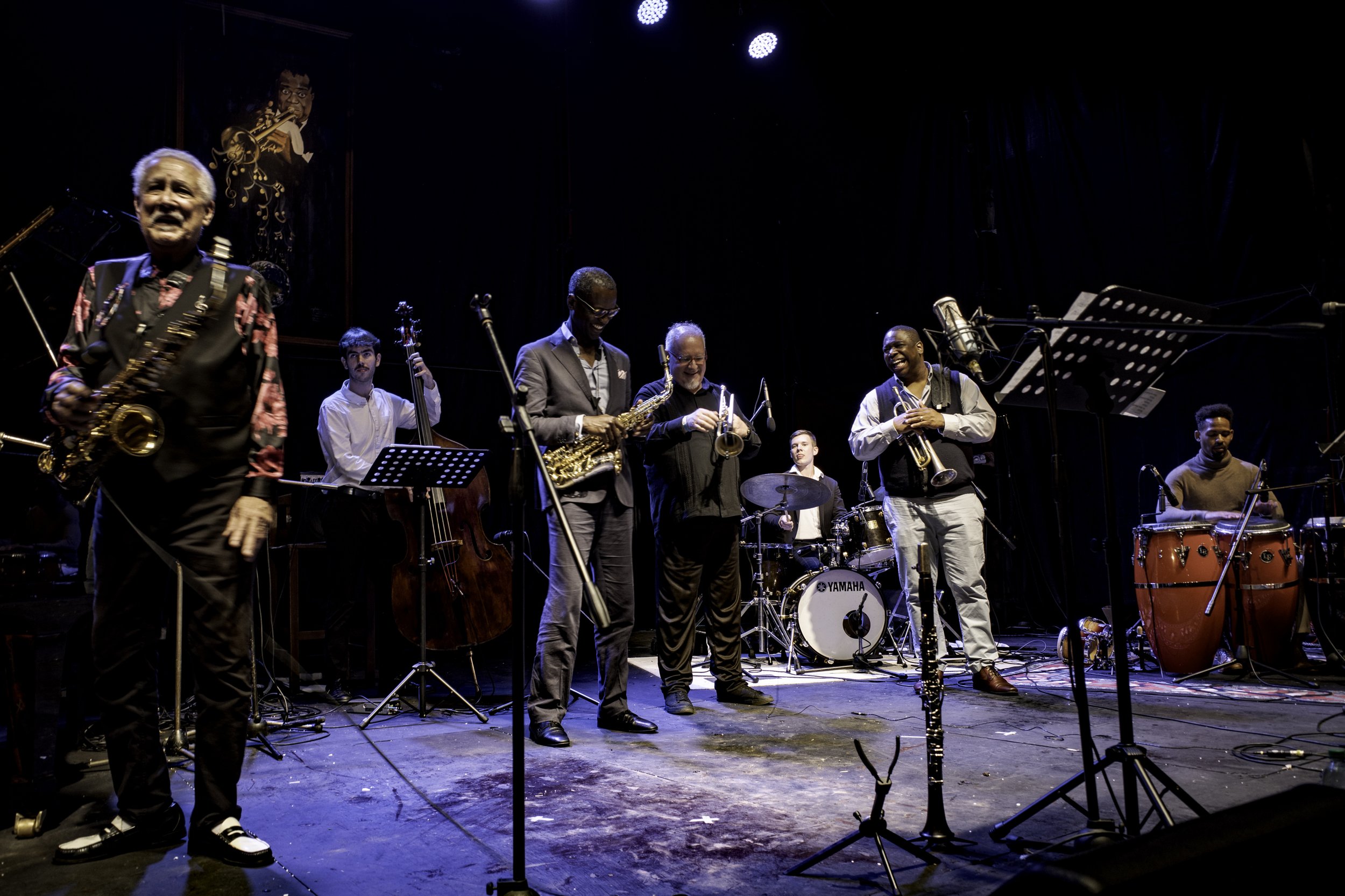 Left to right: Paquito D’Rivera, Mark Gross, Diego Urcola, Julian Miltenberger, Freddie Hendrix, Jansel Torres